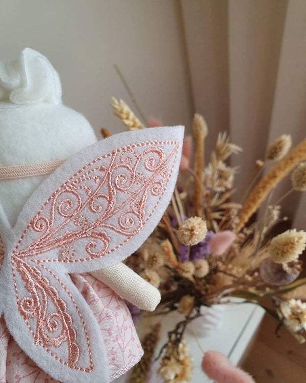 Deze schattige popjes zijn handgemaakt van katoen en de kleding en vleugeltjes kunnen gewisseld worden.
