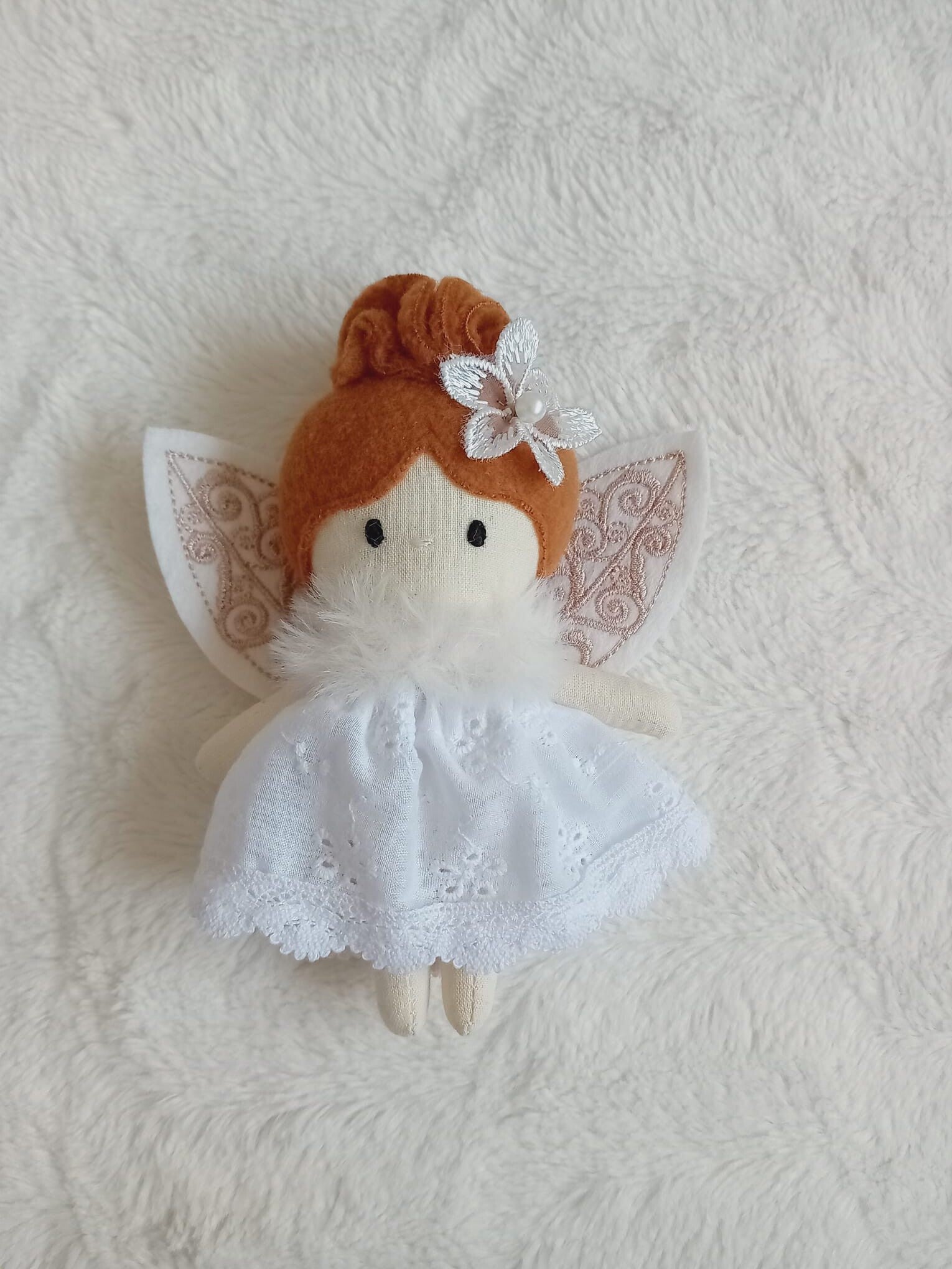 Deze schattige popjes zijn handgemaakt van katoen en de kleding en vleugeltjes kunnen gewisseld worden.