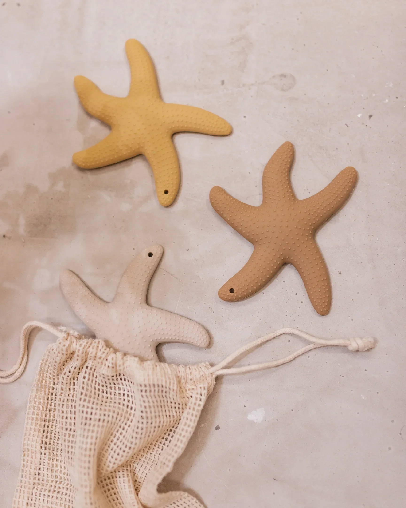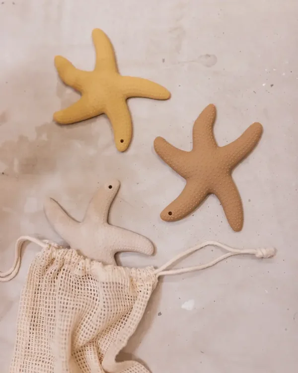 Deze mooie bijtring, in de vorm van een zeester, helpt jeuk of pijn aan de tandjes of tandvlees te verlichten.